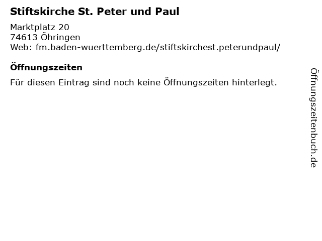 | Öffnungszeiten Stiftskirche St. Peter und Paul in Öhringen anzeigen | |