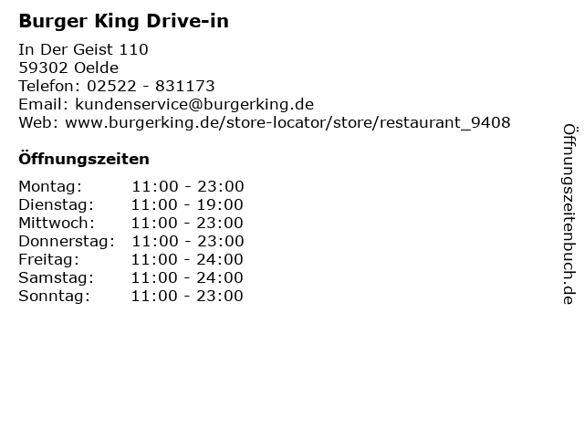 | Öffnungszeiten Burger King Drive-in in Oelde anzeigen | |