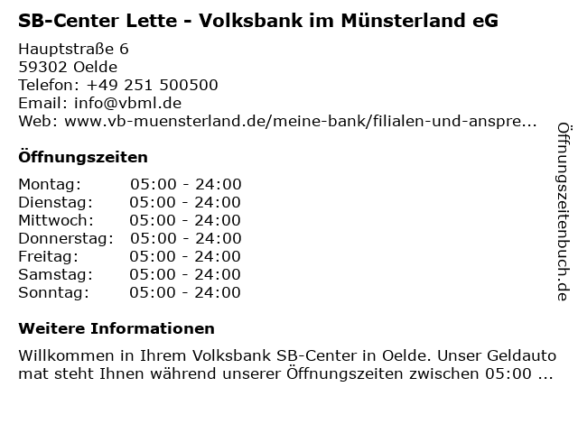 Branchen & Suchbegriffe zu SB-Center Lette - Volksbank im Münsterland eG:bank, bankgeschäfte, bargeld, center, eg, finanzlösungen, geldautomat, lette, münsterland, sb, volksbank |