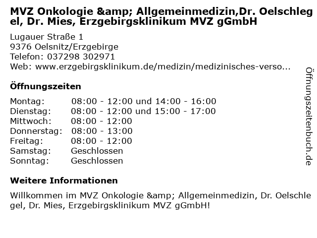 Branchen & Suchbegriffe zu MVZ Onkologie & Allgemeinmedizin,Dr. Oelschlegel, Dr. Mies, Erzgebirgsklinikum MVZ gGmbH:allgemeinmedizin, dr., erzgebirgsklinikum, ggmbh, hämatologie, innere medizin, mies, mvz, oelschlegel, onkologie |