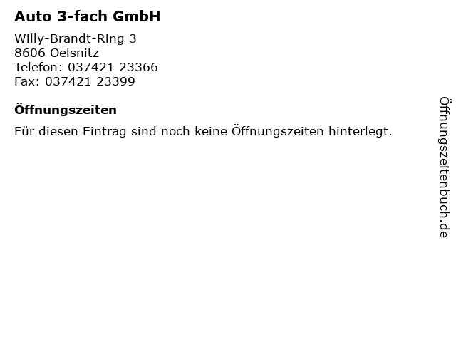 | Öffnungszeiten Auto 3-fach GmbH in Oelsnitz anzeigen | |