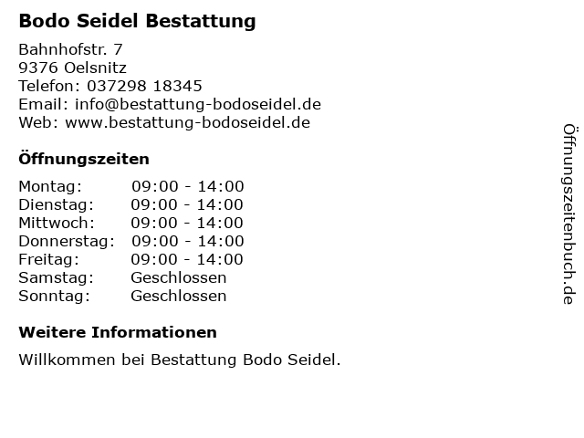 | Öffnungszeiten Bodo Seidel Bestattung in Oelsnitz anzeigen | |