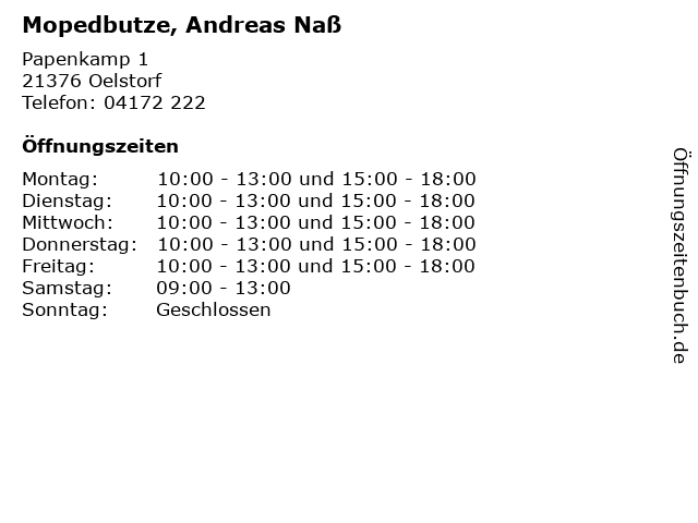 | Öffnungszeiten Mopedbutze, Andreas Naß in Oelstorf anzeigen | |