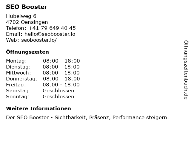 | Öffnungszeiten SEO Booster in Oensingen anzeigen | |