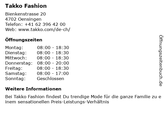 | Öffnungszeiten Takko Fashion in Oensingen anzeigen | |