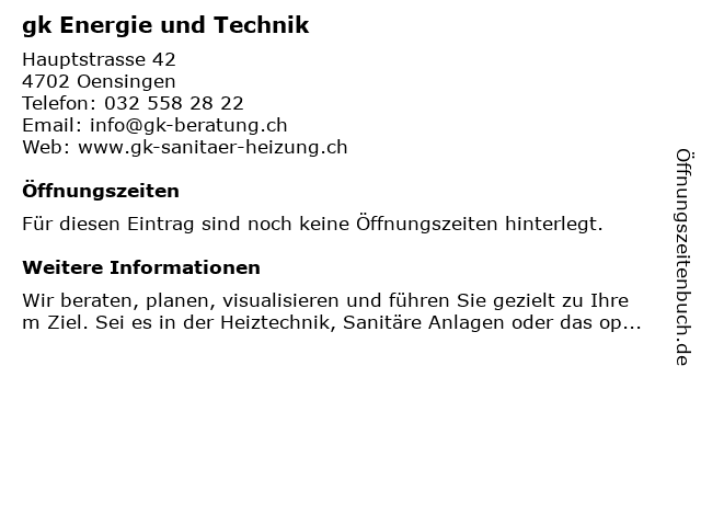 | Öffnungszeiten gk Energie und Technik in Oensingen anzeigen | |