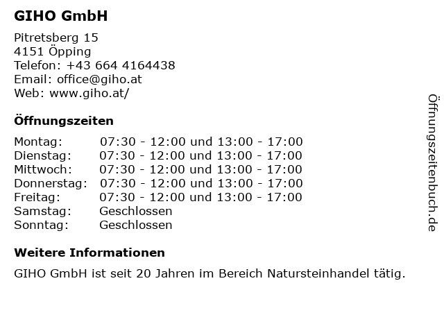 | Öffnungszeiten GIHO GmbH in Öpping anzeigen | |