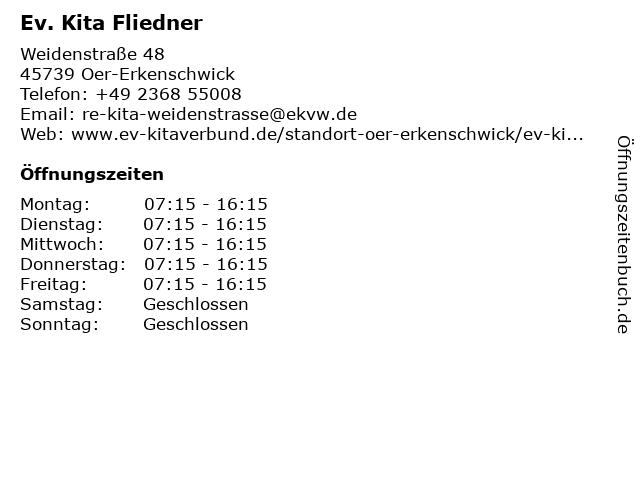 | Öffnungszeiten Ev. Kita Fliedner in Oer-Erkenschwick anzeigen | |