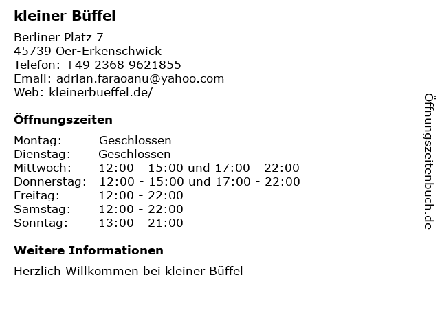 | Öffnungszeiten kleiner Büffel in Oer-Erkenschwick anzeigen | |