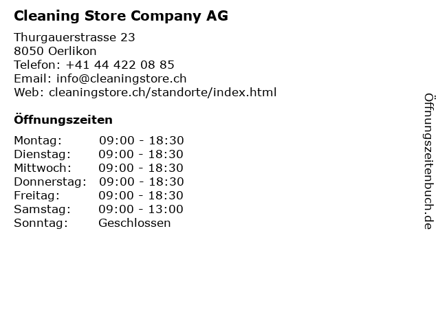 | Öffnungszeiten Cleaning Store Company AG in Oerlikon anzeigen | |
