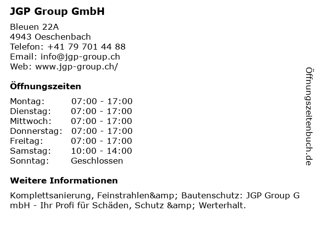 Öffnungszeiten JGP Group GmbH in Oeschenbach anzeigen | |