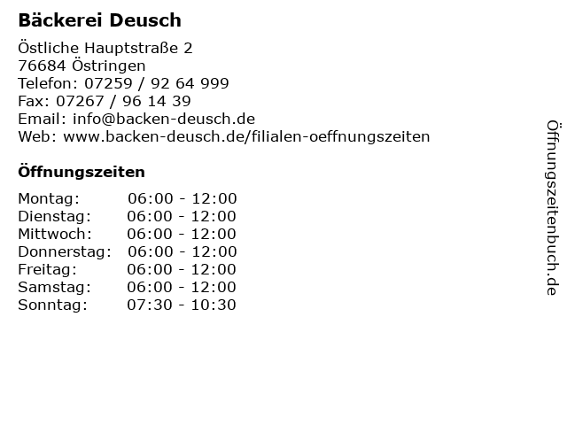 | Öffnungszeiten Bäckerei Deusch in Östringen anzeigen | |
