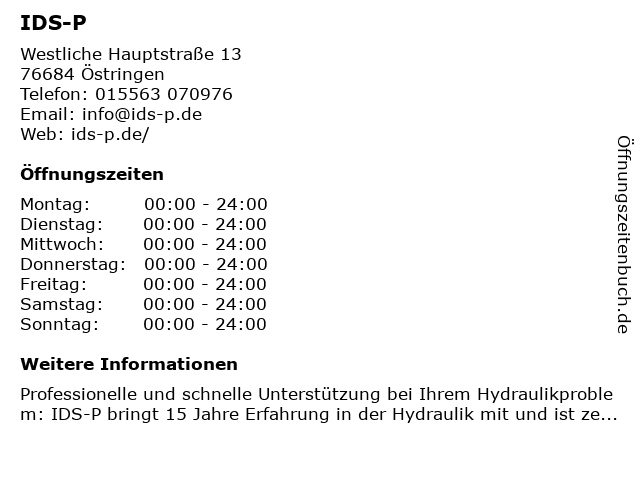 | Öffnungszeiten IDS-P in Östringen anzeigen | |