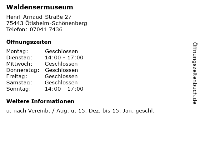| Öffnungszeiten Waldensermuseum in Ötisheim-Schönenberg anzeigen | |
