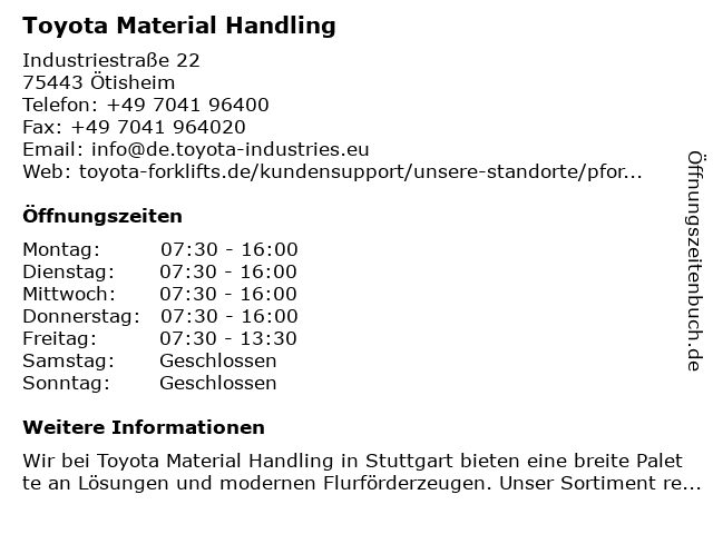 | Öffnungszeiten Toyota Material Handling in Ötisheim anzeigen | |