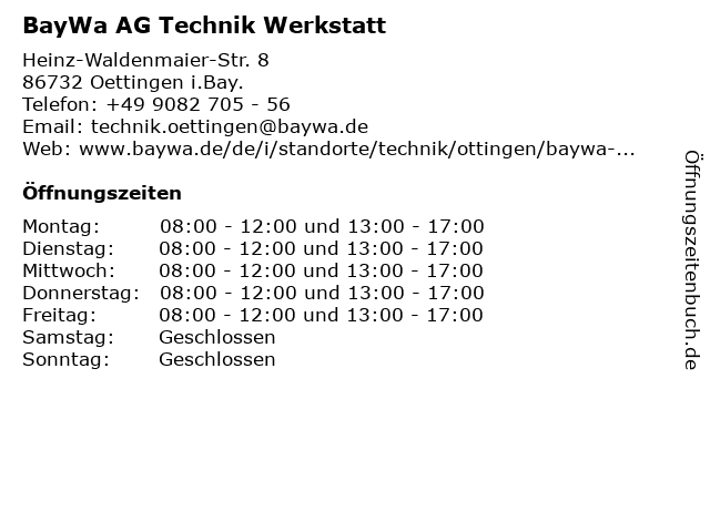 2 BayWa AG Agrar Vertriebsstandort (Entfernung: 0,00 km) Heinz-Waldenmaier-Str. 8, 86732 Oettingen i.Bay. 6 BayWa Bau- & Gartenmärkte GmbH & Co. KG Nördlingen (Entfernung: 11,80 km) Hofer Straße 1, 86720 Nördlingen |