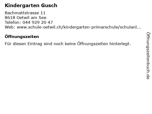 | Öffnungszeiten Kindergarten Gusch in Oetwil am See anzeigen | |