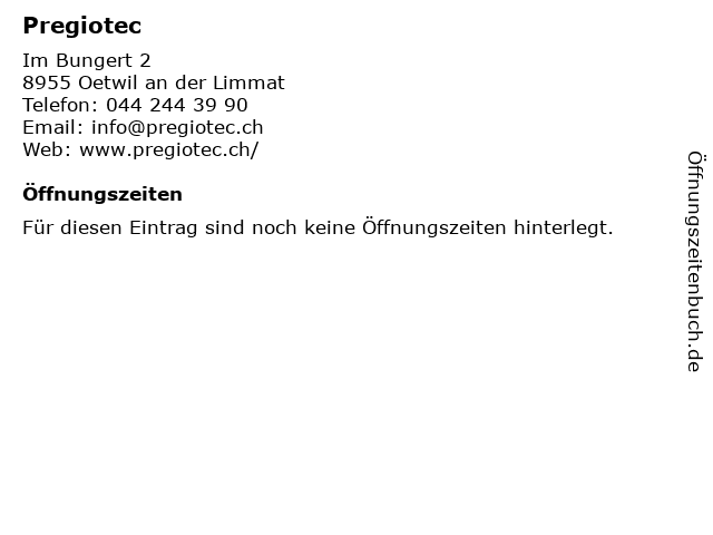 | Öffnungszeiten Pregiotec in Oetwil an der Limmat anzeigen | |