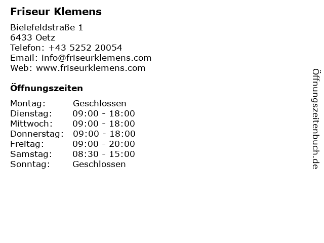 | Öffnungszeiten Friseur Klemens in Oetz anzeigen | |