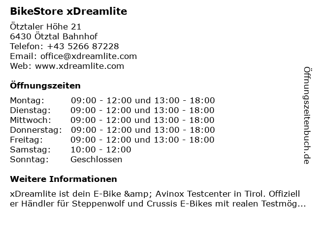 | Öffnungszeiten BikeStore xDreamlite in Ötztal Bahnhof anzeigen | |