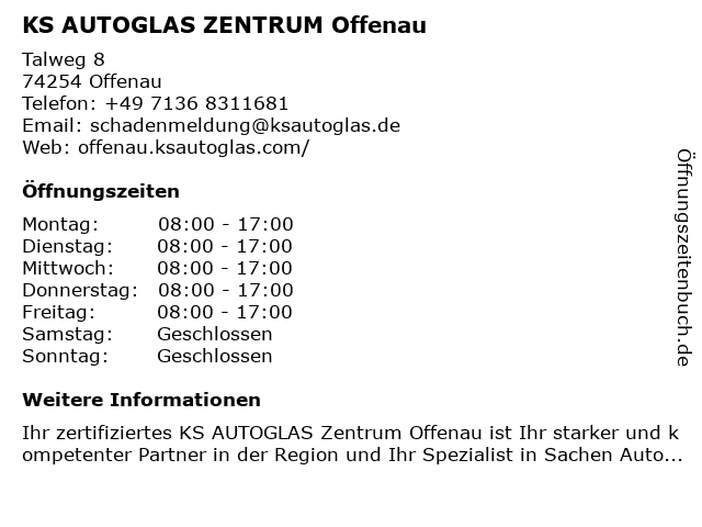 | Öffnungszeiten KS AUTOGLAS ZENTRUM Offenau in Offenau anzeigen | |