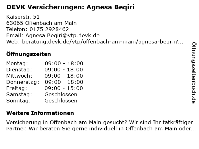 3 DEVK Versicherung: Oktay Hüseyin Kahraman (Berater*in ausgeschieden) (Entfernung: 0,01 km) Kaiserstraße 51, 63065 Offenbach 6 DEVK Versicherung Baktasch Gafari Gebietsleiter (Entfernung: 3,10 km) Sontraer Straße 21A, 60386 Frankfurt |