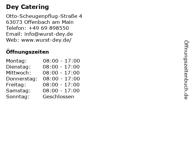 | Öffnungszeiten Dey Catering in Offenbach am Main anzeigen | |