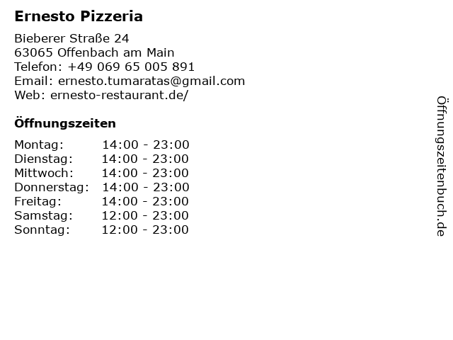 | Öffnungszeiten Ernesto Pizzeria in Offenbach am Main anzeigen | |