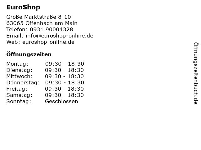 | Öffnungszeiten EuroShop in Offenbach am Main anzeigen | |