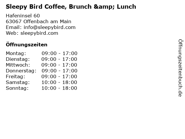 | Öffnungszeiten Sleepy Bird Coffee, Brunch & Lunch in Offenbach am Main anzeigen | |