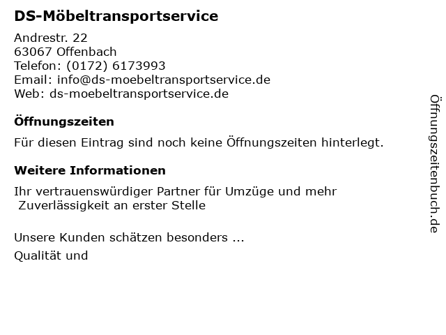 | Öffnungszeiten DS-Möbeltransportservice in Offenbach anzeigen | |