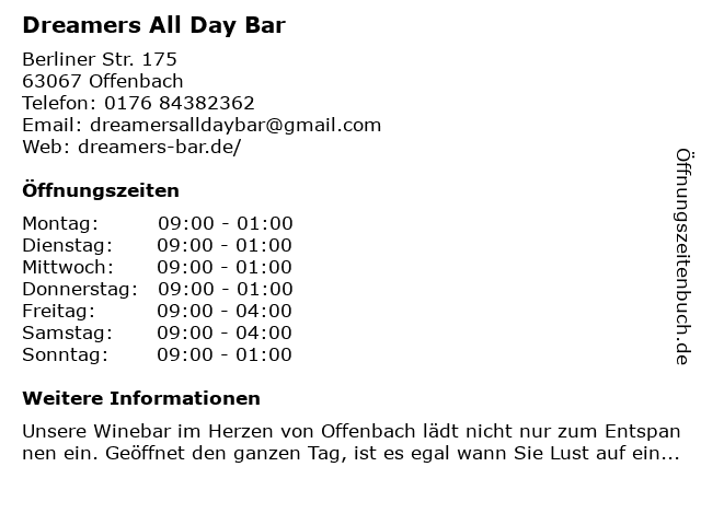Öffnungszeiten Dreamers All Day Bar in Offenbach anzeigen | |