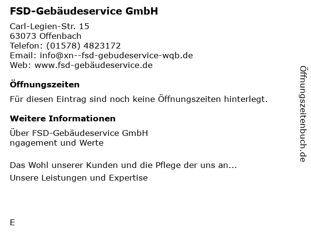 | Öffnungszeiten FSD-Gebäudeservice GmbH in Offenbach anzeigen | |