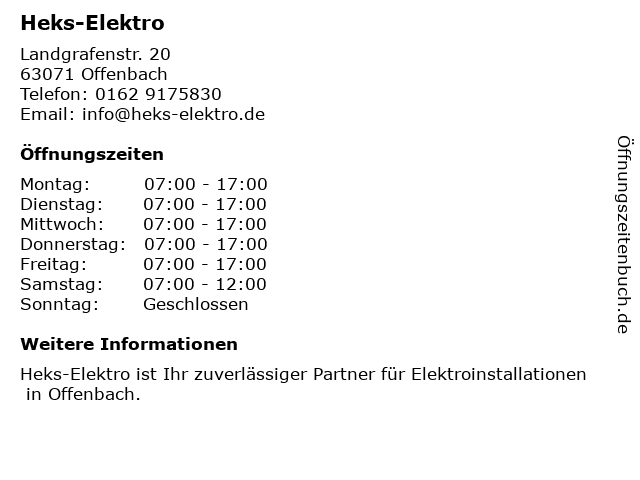 | Öffnungszeiten Heks-Elektro in Offenbach anzeigen | |