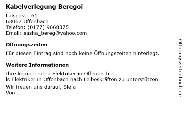 | Öffnungszeiten Kabelverlegung Beregoi in Offenbach anzeigen | |
