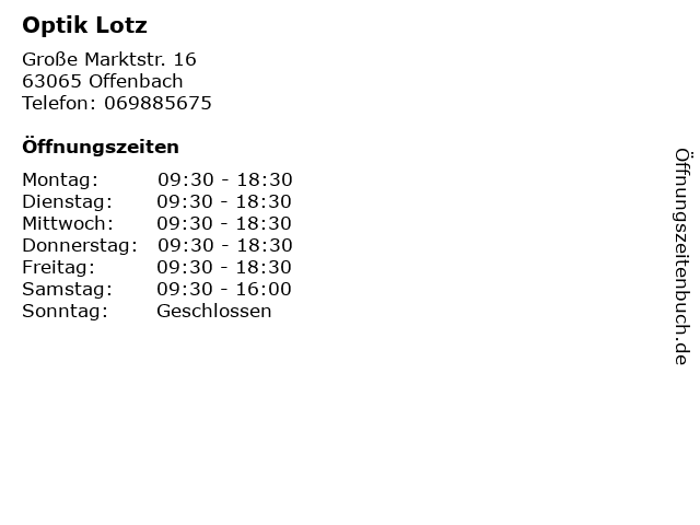 | Öffnungszeiten Optik Lotz in Offenbach anzeigen | |