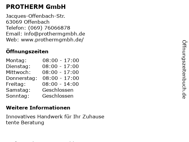 | Öffnungszeiten PROTHERM GmbH in Offenbach anzeigen | |