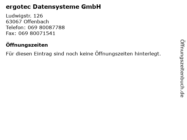 | Öffnungszeiten ergotec Datensysteme GmbH in Offenbach anzeigen | |