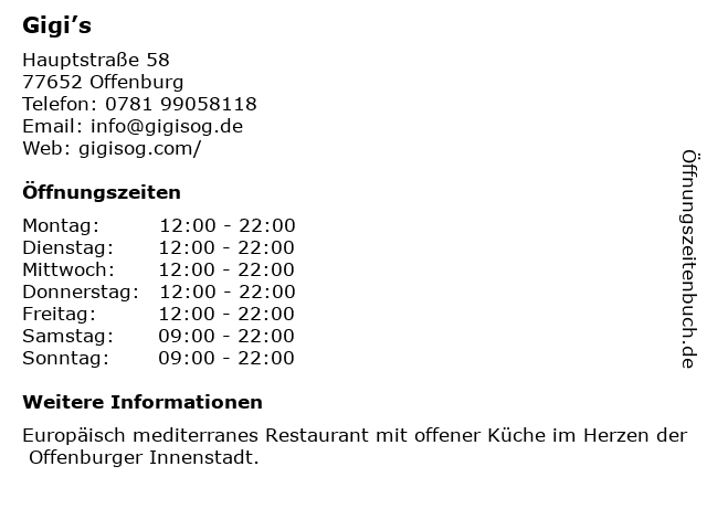 | Öffnungszeiten Gigi’s in Offenburg anzeigen | |