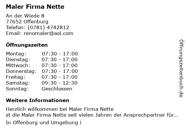 | Öffnungszeiten Maler Firma Nette in Offenburg anzeigen | |