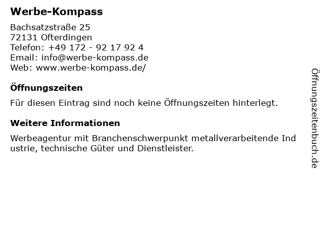 | Öffnungszeiten Werbe-Kompass in Ofterdingen anzeigen | |