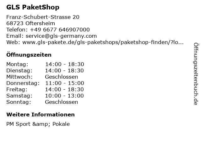 | Öffnungszeiten GLS PaketShop in Oftersheim anzeigen | |
