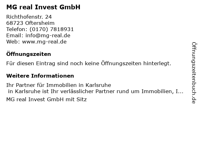 | Öffnungszeiten MG real Invest GmbH in Oftersheim anzeigen | |