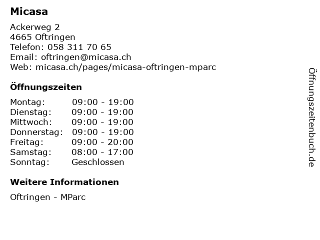 | Öffnungszeiten Micasa in Oftringen anzeigen | |