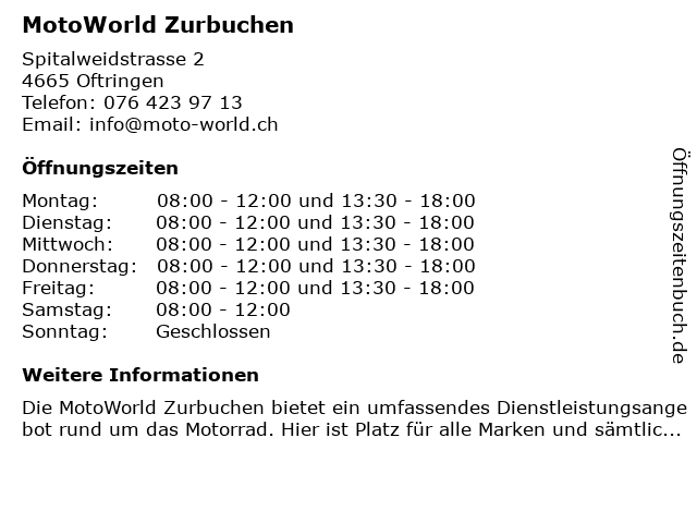| Öffnungszeiten MotoWorld Zurbuchen in Oftringen anzeigen | |