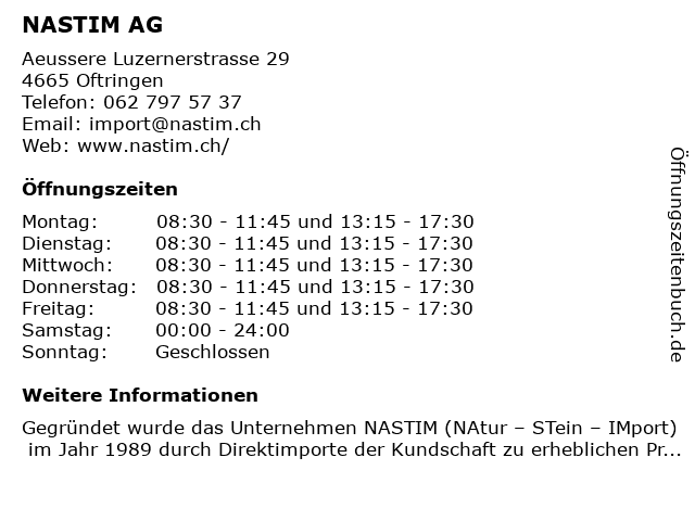| Öffnungszeiten NASTIM AG in Oftringen anzeigen | |