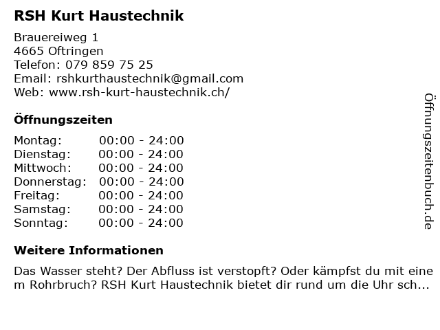| Öffnungszeiten RSH Kurt Haustechnik in Oftringen anzeigen | |