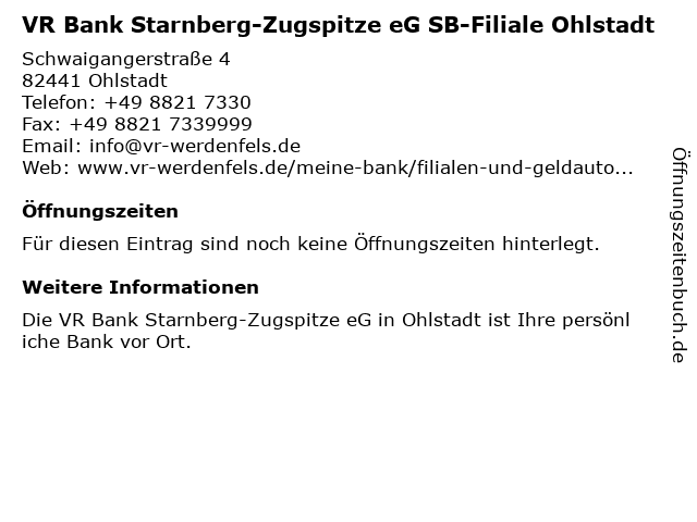 | VR Bank Starnberg-Zugspitze eG SB-Filiale Ohlstadt anrufen | |