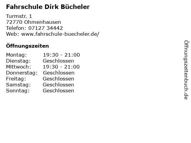 | Öffnungszeiten Fahrschule Dirk Bücheler in Ohmenhausen anzeigen | |