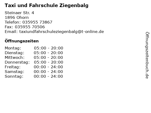 | Öffnungszeiten Taxi und Fahrschule Ziegenbalg in Ohorn anzeigen | |
